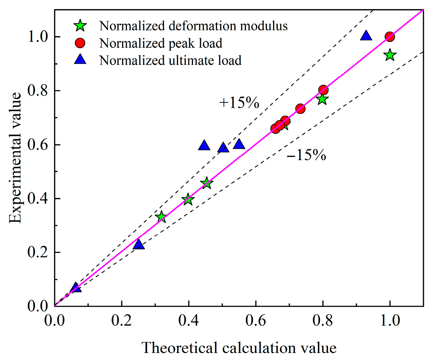 In order to verify the calculation model of the load–displacement curve constructed above, considering that there are many test samples, some of the test samples in this paper are calculated by Equation (9). The calculation results are shown in Figure 15. As shown in Figure 15, the theoretical model calculation curve results are basically in good agreement with the experimental results. Figure 16 shows the comparison between theoretical and experimental values of the specimen. It can be observed that the errors in the mechanical characteristic parameters of the specimen are generally within ±15%, indicating high computational accuracy. This shows that the theoretical model can reflect the mechanical properties of different stages of the test and can predict the test results more accurately.