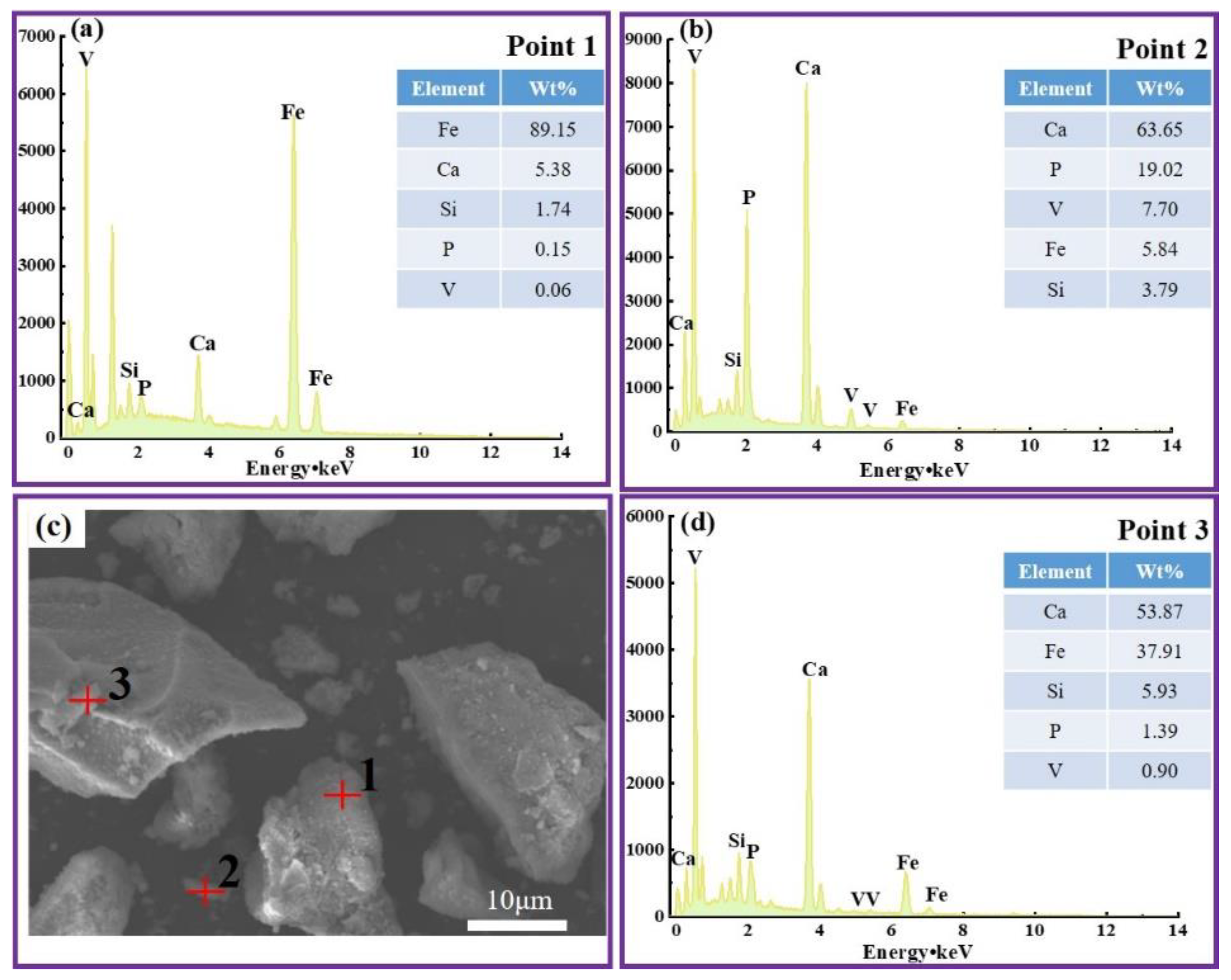 12]: one pathway involves the presence of vanadium as a trace element in the steel slag by blowing. When converting vanadium slag into vanadium-bearing hot metal, approximately 5–10% of the residual vanadium contained in the slag partitions into the semi-refined steel slag, and finally forms vanadium-bearing steel slag with lower grade (V