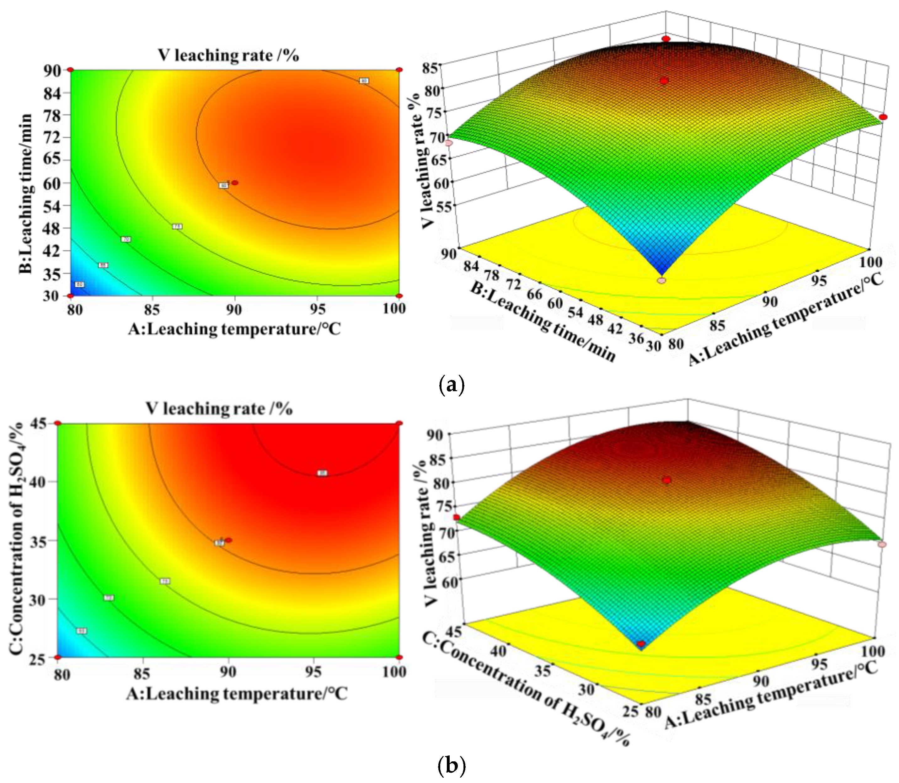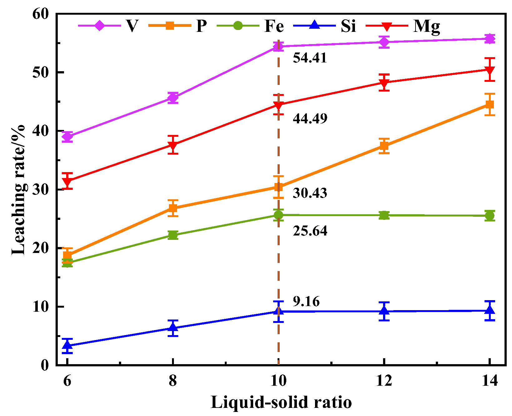24] determined how roasting temperature and leaching conditions influence vanadium leaching rate during calcium roasting-based vanadium extraction. It is found that the vanadium leaching rate exceeds 83% within 30 min when the roasting clinker is placed in dilute sulfuric acid at 55 °C, with a pH value of 2.5. Because the calcium sulfate produced by it is relatively dense, it wraps the vanadium element and hinders the leaching of vanadium; thus, it cannot entirely substitute the conventional sodium salt roasting-based vanadium extraction process [