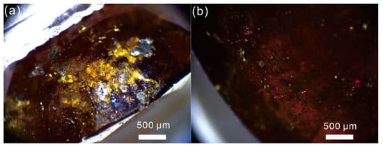 Figure 4. (a,b) Inclusions of Yuanjiang andradite samples. Bar = 500 μm.