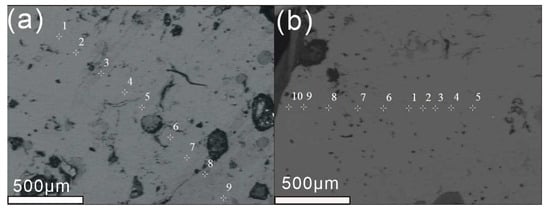 Figure 5. BSE images with the marks of test points of YJ-B4 (a) and YJ-B5 (b). Bar = 500 μm.