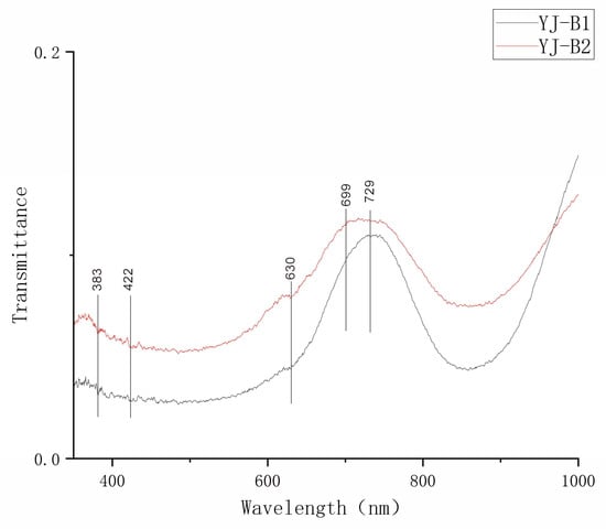 UV-Vis test results show that samples YJ-B1 and YJ-B2 have three transmission windows, namely, a weak transmission window in the green-light region at 560–580 nm, a relatively weak transmission window in the green- to yellow-light region at 585–630 nm, and a strong transmission window in the yellow- to red-light region at 633–857 nm. The transmission windows located in the green-light region and yellow- to red-light region, respectively, may be among the important factors influencing the formation of the Usambara effect.