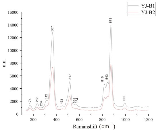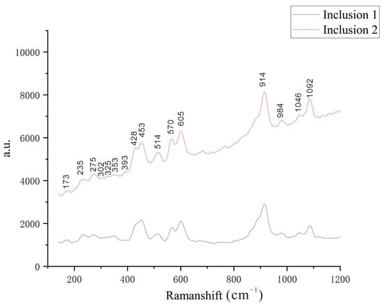 In addition, this time, Raman spectroscopy was also used to test a single green inclusion that was exposed to the surface of sample YJ-B1. A total of 16 Raman-active modes were detected (Figure 9). These Raman-active modes are consistent with the active modes reported for the (001) plane of epidote in previous studies [34]. Therefore, it is believed that the green mineral inclusion should be epidote [34].