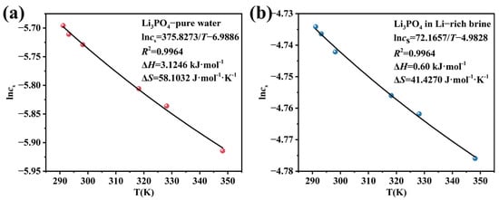 The direct determination of Li3PO4 solubility in pure water is challenging because the formation of a fine colloid impedes effective filtration [45]. Wu et al. [46] pointed to the ongoing hydrolysis of PO43− and the dissolution-conversion of Li3PO4 with increasing time, which prevents the attainment of a stable equilibrium for accurate solubility measurement. The solubility value of Li3PO4 in pure water, widely used in important manuals at present, is 0.394 g/kg at 291.15 K. In our previous study [40], the solubilities of Li3PO4 in both pure water and Li-rich brine were measured via the isothermal dissolution equilibrium method [47,48] across a temperature range of 291.15 to 348.15 K; these data are summarized in Table 3. The solubility values obtained in our previous work [40] were slightly higher than those reported by Wu et al. [46], a discrepancy likely attributable to differences in the dissolution time. The solubility data were fitted using the van’t Hoff equation, as shown in Figure 3. The high coefficient of determination (R2 > 0.996) for both systems indicates an excellent fit to the model.