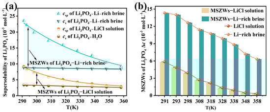 (a) Supersolubility and (b) MSZWs of Li3PO4 in LiCl solution and Li-rich brine over the temperature range of 291.15 K to 363.15 K.