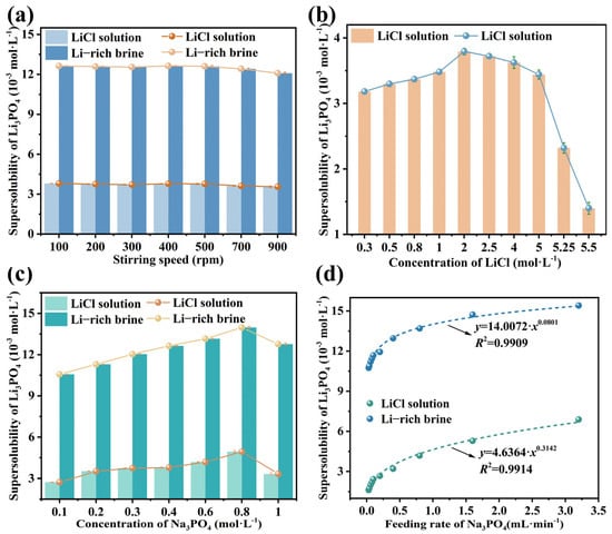 Stirring Speed: the supersolubility was determined across a stirring speed range of 100 to 900 rpm under the following conditions: a Na3PO4 solution feeding rate of 0.5 mL·min−1, with LiCl and Na3PO4 concentrations of 1.3 and 0.4 mol·L−1, respectively, as shown in Figure 5a. It can be seen that an increase in stirring speed leads to a slight decrease in supersolubility. Related studies suggest that stirring exerts two opposing effects: it accelerates mass transfer and facilitates nucleation, yet it may also disrupt crystal embryos and impede nucleus formation. The net effect on supersolubility is thus a synergy of these competing mechanisms. This dual mechanism may account for the slight increase in supersolubility observed at 400 rpm.