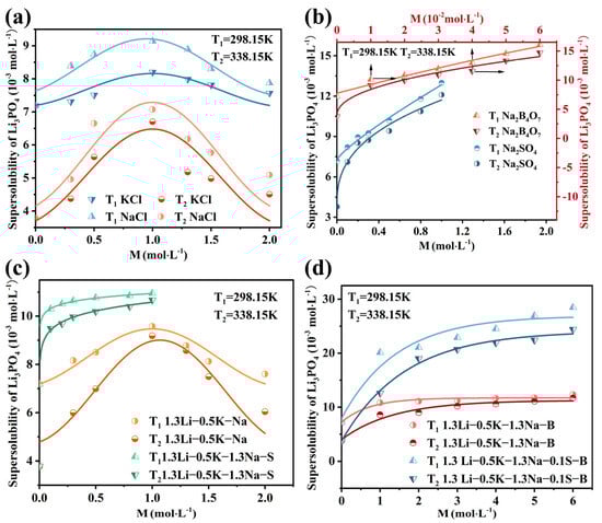 Single Salts System: the primary concomitant salts in the Li-rich brine of the Dong-Taijinaier salt lake are KCl, NaCl, Na2SO4, and Na2B4O7; thus, these were selected as representative impurities for this study. The supersolubility csp of Li3PO4 in single salt solutions KCl (0–2 mol·L−1), NaCl (0–2 mol·L−1), Na2SO4 (0–1 mol·L−1), and Na2B4O7 (0–0.06 mol·L−1) is determined at 298.15 K and 338.15 K (Figure 6a,b). A general trend of decreasing supersolubility with increasing temperature was observed across all systems.
