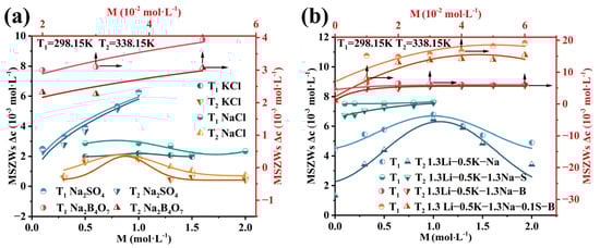 MSZWs of Li3PO4 in Single and Li-Na-K-B-Cl-S Mixed-Salt Solutions: the MSZWs were calculated from previously reported solubility data for Li3PO4 in single-salt (NaCl, KCl, Na2SO4, and Na2B4O7) and Li-Na-K-B-Cl-S mixed-salt solutions [40]. As shown in Figure 7a,b, the MSZWs of Li3PO4 decreased with increasing temperature across all systems. Notably, the variation in the MSZWs with solution composition closely paralleled the corresponding trends in supersolubility, indicating that the MSZWs are primarily governed by the supersolubility.