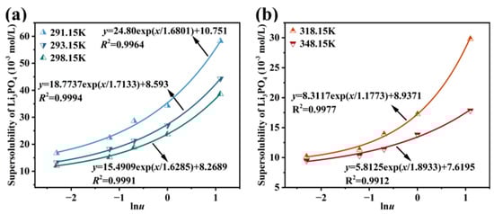 Correlation of Li3PO4 supersolubility using an empirical equation at different temperatures: (a) 291.15 K, 293.15 K, and 298.15 K; (b) 318.15 K and 348.15 K.