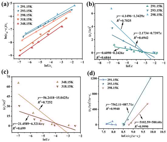 Modified Sangwal’s Theory Model: the modified Sangwal’s theory (Equation (7)) was applied, which posits a linear relationship between (cs/∆c)2/(∆c − cs) and lnUc/cs(∆c − cs), as illustrated in Figure 9d. The corresponding coefficients of determination (R2) were exceptionally high, ranging from 0.994 to 0.999 (Table 8), confirming the model’s excellent fit and its suitability for predicting the MSZWs of Li3PO4 in Li-rich brine within the studied temperature range (293.15 K to 348.15 K). However, the modified theory has a significant limitation: the term (∆c − cs) can attain negative values under certain conditions. When this occurs, the mathematical formulation of the model breaks down, preventing a physically meaningful prediction. This situation typically arises when the metastable zone width is too narrow for the model’s assumptions to hold, thereby limiting its practical application.