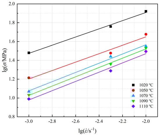 where is the flow stress during the thermal deformation process of the metallic material, is the strain rate, K is a constant determined by the material’s properties, and m is the strain rate sensitivity index. After mathematical transformation of Equation (1), could be obtained, indicating that the m-value corresponded to the slope of the lgσ-lg curve, specifically