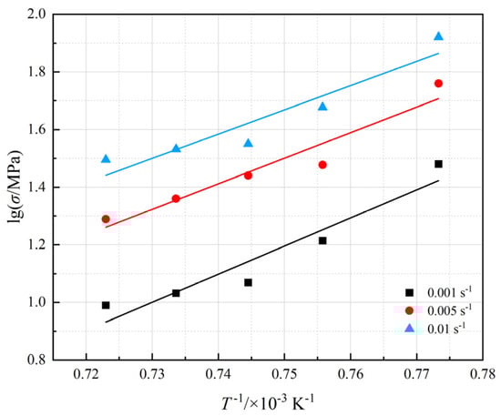 In the equation, represents the strain rate; A is a dimensionless constant; D denotes the diffusion coefficient, expressed as D0exp(−Q/RT), where D0 is a frequency factor; Q is the deformation activation energy; R stands for the ideal gas constant; G signifies the shear modulus; b is the Burgers vector; k refers to the Boltzmann constant; T indicates the deformation temperature; d represents the grain size; p is the grain size exponent; σ corresponds to the flow stress; and n denotes the stress exponent. Assuming constant grain size and strain rate, a mathematical transformation of Equation (3) yields the apparent activation energy at constant strain rate, as shown in Equation (4):