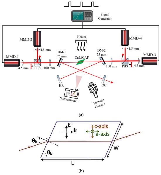 To estimate the temperature inside the gain medium, we employed a standard X-folded cavity setup with both optical and thermal diagnostics as shown in Figure 1. A Cr:LiCAF crystal (1.25% Cr-doped, 15 × 7 × 2 mm3) was mounted in a water-cooled copper holder stabilized at 15 °C. Four 660 nm multimode laser diodes (MMD-1 to MMD-4) were used as pump sources. Each diode output was first collimated using 4.5 mm focal-length aspheric collimation lenses. The pump beams were then combined by means of polarizing beam splitters (PBSs) and subsequently focused into the crystal using achromatic doublet lenses with a focal length of 100 mm, resulting in an approximately 25 × 65 µm pump spot size at the crystal. Two dichroic cavity mirrors (DM-1 and DM-2), highly transmissive at the pump wavelength (660 nm) and highly reflective around the laser emission wavelength (~800 nm), were used to separate the pump radiation from the resonator mode and to fold the cavity arms. The optical cavity further included a high-reflector mirror (HR) and an output coupler (OC) to guide and extract the laser radiation along the folded resonator geometry during alignment and diagnostic measurements. The pump diodes were operated in pulsed mode (1 Hz repetition rate, 10 ms pulse duration) to generate a peak pump power of 1.7 W while minimizing thermal loading during calibration procedures. Fluorescence emission spectra were collected using an Ocean Optics HR4000 spectrometer (Ocean Optics, Dunedin, FL, USA) with a spectral resolution of 0.25 nm. The spectrometer position was carefully optimized to maximize the signal-to-noise ratio and minimize geometric distortion. The crystal temperature was increased in 0.5 °C increments using a controllable heat blower, while real-time temperature monitoring was performed simultaneously with a FLIR E75 thermal camera (Wilsonville, OR, USA) and an additional thermal sensor mounted directly on the copper holder. In addition to spectrometer-based emission analysis, thermal images were captured at various diode current levels (0 A, 1.5 A, 2.0 A, and 2.5 A) to compare surface temperature variations with internal temperature predictions. Each measurement was performed after thermal stabilization to ensure accurate correlation between the spectral data and thermal camera output. Calibration data were acquired across 181 temperature points between 10 and 100 °C.