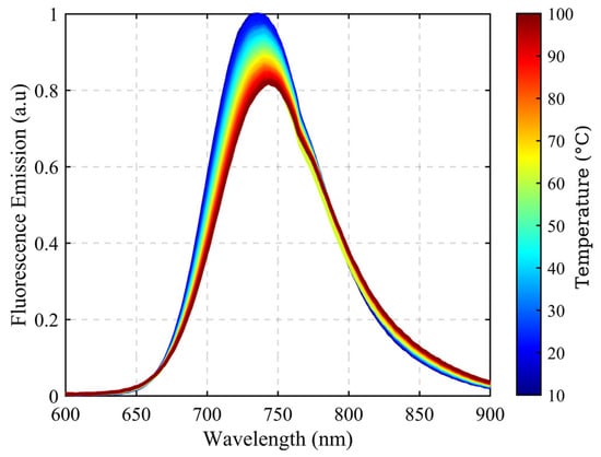 Figure 2 shows the measured emission spectrum of Cr:LiCAF at the temperature between 10 and 100 °C in normalized units. The collected emission data shows that Cr:LiCAF crystal has an emission peak around 740 nm. It is clearly observed that with the upraised temperature on the crystal, the emission lines broaden and shift near the peak due to increased phonon interactions. The blue lines indicate fluorescence emission at 10 °C and the central wavelength of around 730 nm, while the red curves represent crystal temperatures above 90 °C. The central wavelength shift between 90 °C is clearly seen. Moreover, this results in the expected intensity decrease. Building on previous studies, we constructed a reference curve for temperature estimation [18]. The spectral change caused by the temperature change is the best option for this purpose. There are different reported techniques based on this change (Peak method, FWHM method, differential luminescence thermometry (DLT), dip method) [19]. This study is focused especially on the peak method, where the emission peak is shifted because of temperature change. A weak secondary emission band at 760–765 nm is also observed in the spectra, which originates from higher-order vibronic transitions of the Cr3+ ions. However, this band remains significantly weaker than the dominant fluorescence peak centered near 740 nm. In the peak extraction procedure, a constrained single-peak fitting algorithm was applied only to the dominant 740 nm band, and the influence of the secondary band on the extracted peak position was verified to be negligible within the spectral resolution of the system.