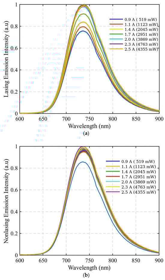 As a next step, to perform the temperature measurements from the reference curve, we have employed two different conditions. In the first part, using the same setup and operating conditions, the system was configured to operate under lasing conditions. The temperature of the crystal holder is set to 15 °C to not damage crystal. While the cavity is in continuous-wave lasing, emissions data with respect to diode currents is collected. The obtained curves are prepared for the peak extraction with post-processing. Note that, during cw lasing the peak emission collected from the lasing region of Cr:LiCAF is 800 nm. To be more precise, we removed the monochromatic lasing component through spectral post-processing. During measurements, the four diodes of the cavity are actively used to maximize the thermal load within the limitations of our laboratory setup. Figure 4 shows the measured emission spectrum of Cr:LiCAF while active lasing creates additional thermal effects. In other cases, we have blocked the output coupling to prevent the lasing. For both cases, to estimate the temperature inside the crystal, the same method is employed. For all spectra shown in Figure 4, the Cr:LiCAF crystal was mounted in a temperature-stabilized copper holder at 15 °C. The diode current was varied at 0.9, 1.1, 1.4, 1.7, 2.0, 2.3, and 2.5 A, corresponding to incident pump powers of 519 mW, 1123 mW, 2045 mW, 2952 mW, 3869 mW, 4763 mW, and 5355 mW, respectively. These operating points were used to induce controlled thermal loading under both lasing and non-lasing conditions.