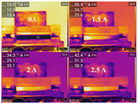 To quantify the agreement between the internal temperatures estimated via fluorescence peak shifts and those measured by the FLIR E75 thermal camera, a mean absolute error () analysis was conducted [30]. The resulting value was 0.775 °C, with a maximum deviation of 1.4 °C observed at the highest current setting (2.5 A). Furthermore, the coefficient of determination (R2) between the two datasets was calculated to be 0.993, indicating an excellent linear correlation. These results confirm that the optical thermometry method provides reliable estimates of internal crystal temperature, closely matching the surface readings of infrared thermography.