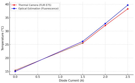 Comparison of temperature values measured by thermal imaging (FLIR E75) and estimated via fluorescence peak shifts at various diode current levels. The close agreement (within ±1.5 °C) confirms the reliability of spectrometer-based temperature prediction. The estimated uncertainty of the optical method is ±0.5–1 °C based on spectrometer resolution and calibration parameters.