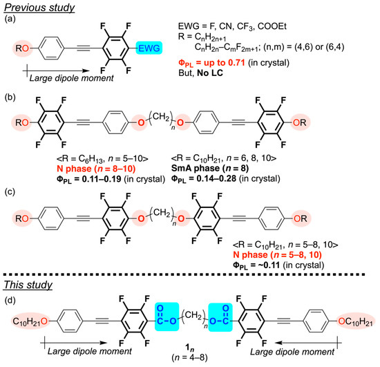 However, the strong aggregation induced by these interactions suppressed LC phase formation, even when the flexible chains were elongated [26], hindering the simultaneous realization of PL and LC behaviors. To address this, we designed mesogenic dimers, in which two tetrafluorinated tolane units were linked by an alkylene-1,n-dioxy spacer [27,28]. This approach reduced the crystallinity of the material and enabled the coexistence of PL and LC properties (Figure 1b,c). Nonetheless, the electron density distribution within the π-conjugated framework remained insufficient, resulting in weak PL in both solution and solid states.