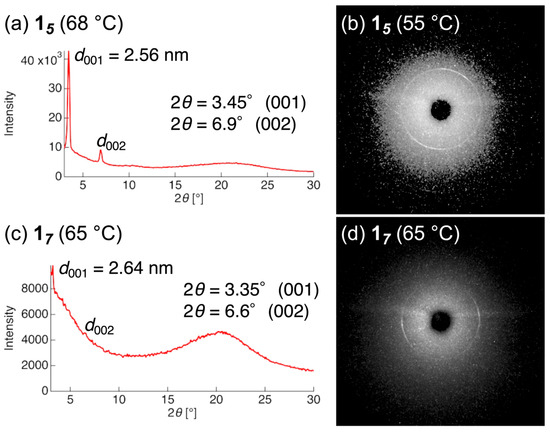 One-dimensional PXRD patterns of compounds (a) 15 and (c) 17, and two-dimensional small-angle X-ray scattering profiles of (b) 15 and (d) 17, as measured for the mesophase formed during the cooling process.