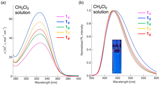 The CH2Cl2 solutions of compounds 14–18 were transparent in the 400–800 nm region. Below 400 nm, they exhibited absorption maxima (λabs) at 326–327 nm, as shown in Figure 6a. To elucidate the nature of these absorptions, time-dependent DFT (TD-DFT) calculations were performed using the optimized geometries obtained from DFT and including the CPCM solvation model for CH2Cl2 (Figure 6, Table 2).