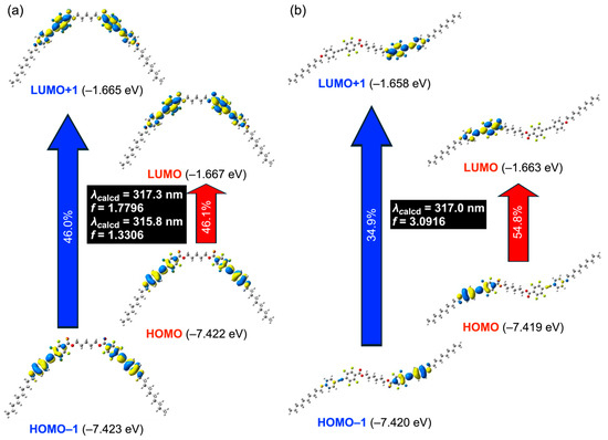 Furthermore, molecular orbital diagrams of HOMO/HOMO–1 and LUMO/LUMO+1 revealed substantial electron density on the electron-rich alkoxy-substituted aromatic rings, whereas the electron-deficient ester-substituted aromatic rings exhibited smaller electron distributions. These results confirm the presence of a typical D–π–A electronic structure. Indeed, our previous studies demonstrated π-π* transitions originating from intramolecular charge transfer (ICT) states in fluorinated tolanes bearing ester functionality as electron-withdrawing substituents [24,26], and a similar ICT-based π-π* transition is inferred here for the present mesogenic dimer systems.