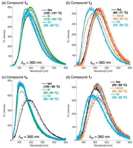Finally, the PL behaviors of compounds 14–17, which exhibited an LC phase upon cooling, were investigated in the mesophase during the cooling process; the samples were first heated to the Iso phase and subsequently cooled gradually, during which the PL spectra were recorded at each temperature, at 2 °C intervals near the phase transition and at 5 °C intervals otherwise (Figure 8 and Figure S29).