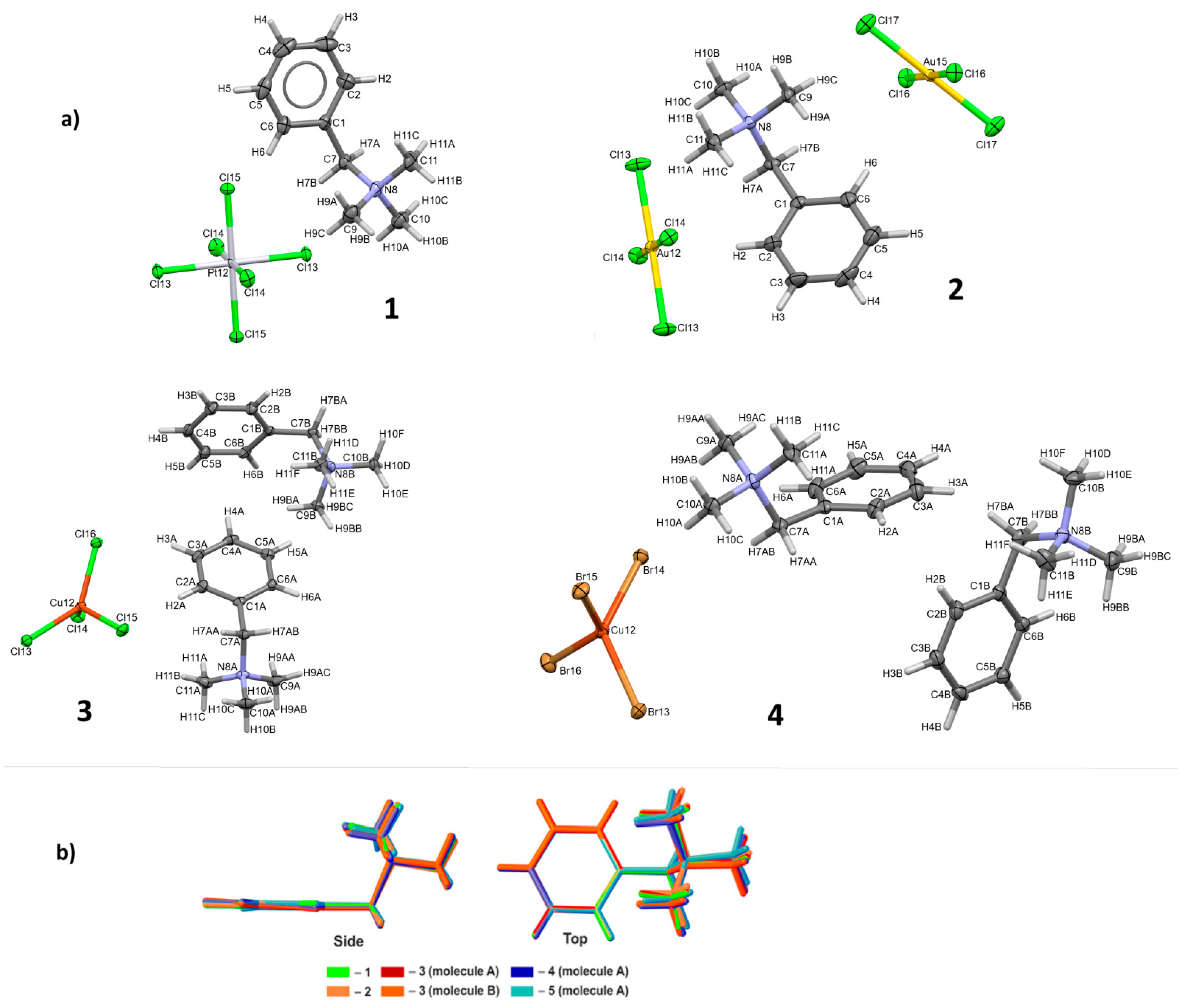 Bojarska, J.; Breza, M.; Jelemenska, I.; Madura, I.D.; Jafari, S.; Trzybiński, D.; Woźniak, K.; Mieczkowski, A. The Comparative Study of Four Hexachloroplatinate, Tetrachloroaurate, Tetrachlorocuprate, and Tetrabromocuprate Benzyltrimethylammonium Salts: Synthesis, Single-Crystal X-Ray Structures, Non-Classical Synthon Preference, Hirshfeld Surface Analysis, and Quantum Chemical Study. Crystals 2025, 15, 1051. https://doi.org/10.3390/cryst15121051
