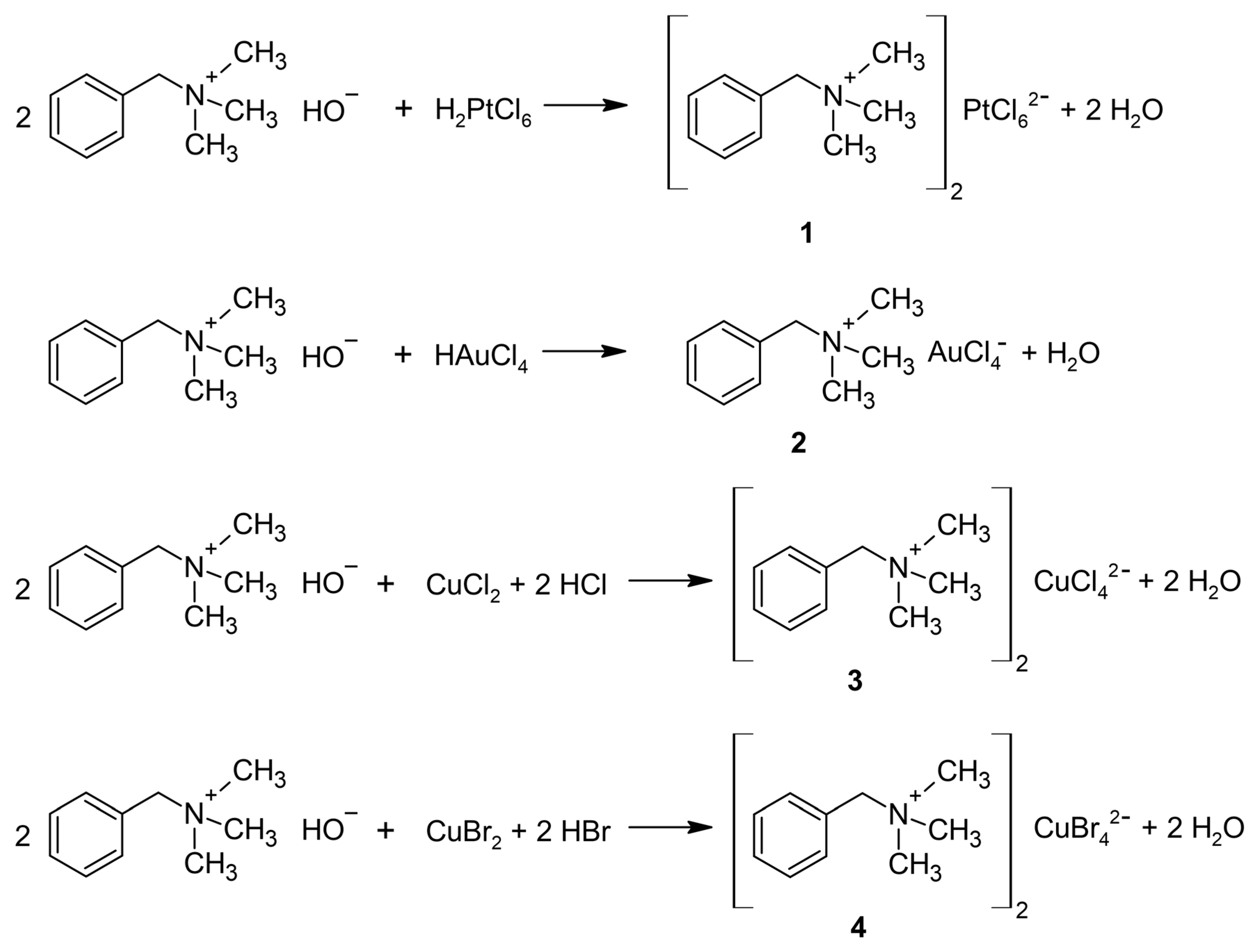 | Compound | (BTMA)2[PtCl6] | (BTMA)[AuCl4] | (BTMA)2[CuCl4] | (BTMA)2[CuBr4] | BTMA+ in H2O |