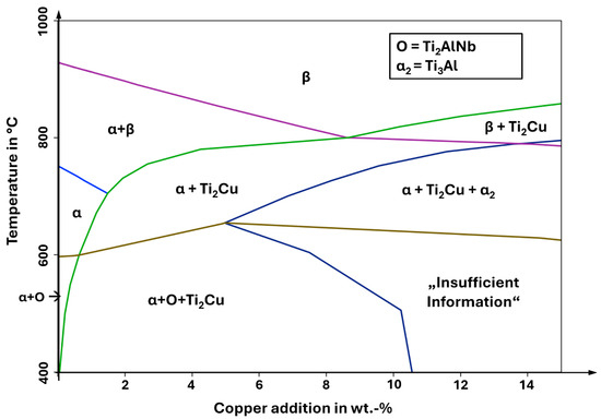 Pseudobinary equilibrium phase diagram for the system Ti-6Al-7Nb + Cu as a function of temperature, calculated via CALPHAD using Thermo-Calc 2024b and the TCTI6 database [42].
