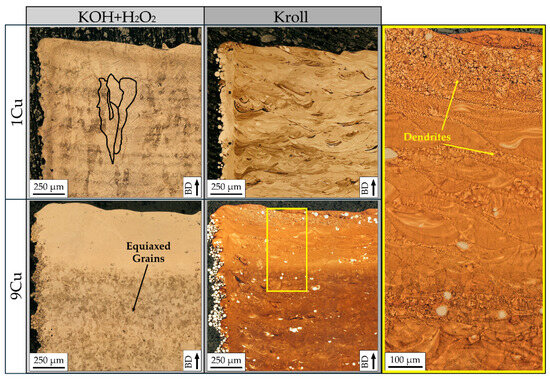 LOM micrographs of samples from 1Cu and 9Cu, etched with KOH + H2O2 and Kroll. Epitaxially grown prior β grains are marked in black in 1Cu-KOH. Shown enlarged on the right is the section outlined in yellow in 9Cu-Kroll (bottom centre), showing the fine dendritic microstructure that forms during solidification.