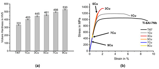 For illustration and ease of comparison, the most representative stress–strain curve obtained from tensile testing for each copper addition, as well as for unmodified Ti67, is presented. Furthermore, the copper addition exerts only a minor influence on Young’s modulus, which increases from approximately 105 GPa for Ti-6Al-7Nb to a maximum of 111 GPa for 5Cu, before decreasing again for 7Cu and 9Cu.