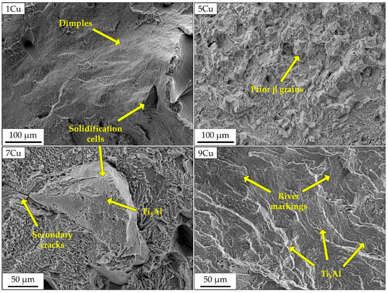 Regarding the fracture mode, the transition from ductile to brittle occurs at 5 wt.% Cu, with both brittle and ductile features visible in the fracture surfaces of 5Cu as shown in Figure 7. Small dimples indicating a ductile fracture mode can be seen on prior β grains, indicating intergranular fracture right beside transgranular flat cleavage facets with a size of just a few microns. As expected from the tensile tests, the fracture surfaces of 7Cu and 9Cu exhibit no dimples or areas of plastic deformation. Occasional intercrystalline features on these samples are covered with solidification cells rich in copper, as determined via EDS.