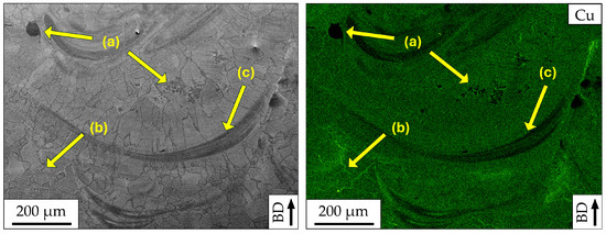 EDS map showing the copper distribution in Ti67 + 9Cu in the upper part of the sample regarding the build height, with (a) partially molten Ti-6Al-7Nb particles, (b) small grains in areas of higher copper concentration with copper rich grain boundaries and (c) larger grains in areas of lower copper concentration partially growing epitaxially indicating grain refinement with local columnar-to-equiaxed transition is caused by the copper addition.