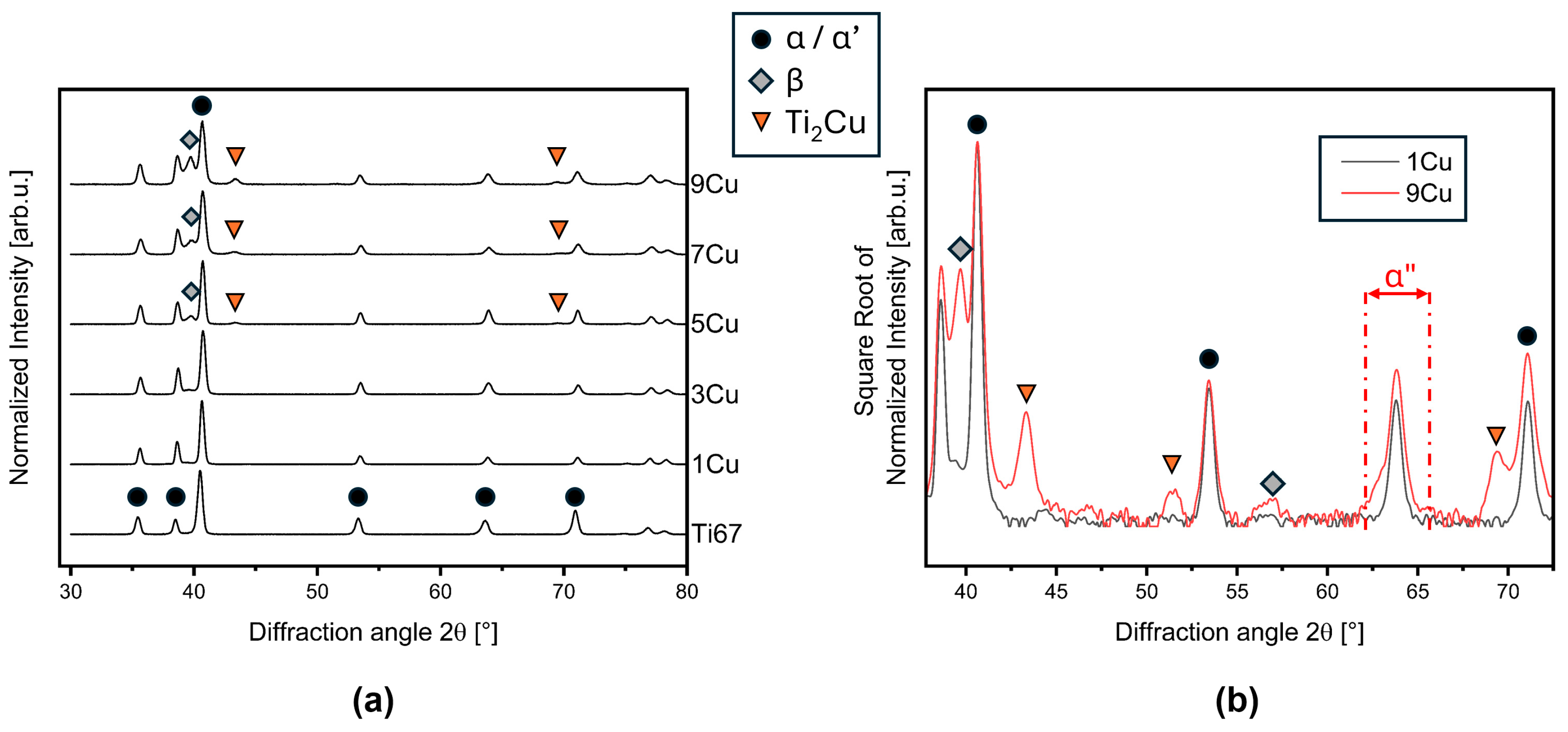 Figure 3. Increasing the copper content has a significant effect on the observed phase composition. XRD analysis of the Ti67 reference sample reveals only diffraction angles typical of an α/α′ microstructure, probably overall martensitic owing to the high cooling rates during PBF-LB/M. The 1Cu alloy exhibits a similar diffraction pattern, with diffraction angles nearly identical to Ti67 but with noticeable changes in the relative intensities.