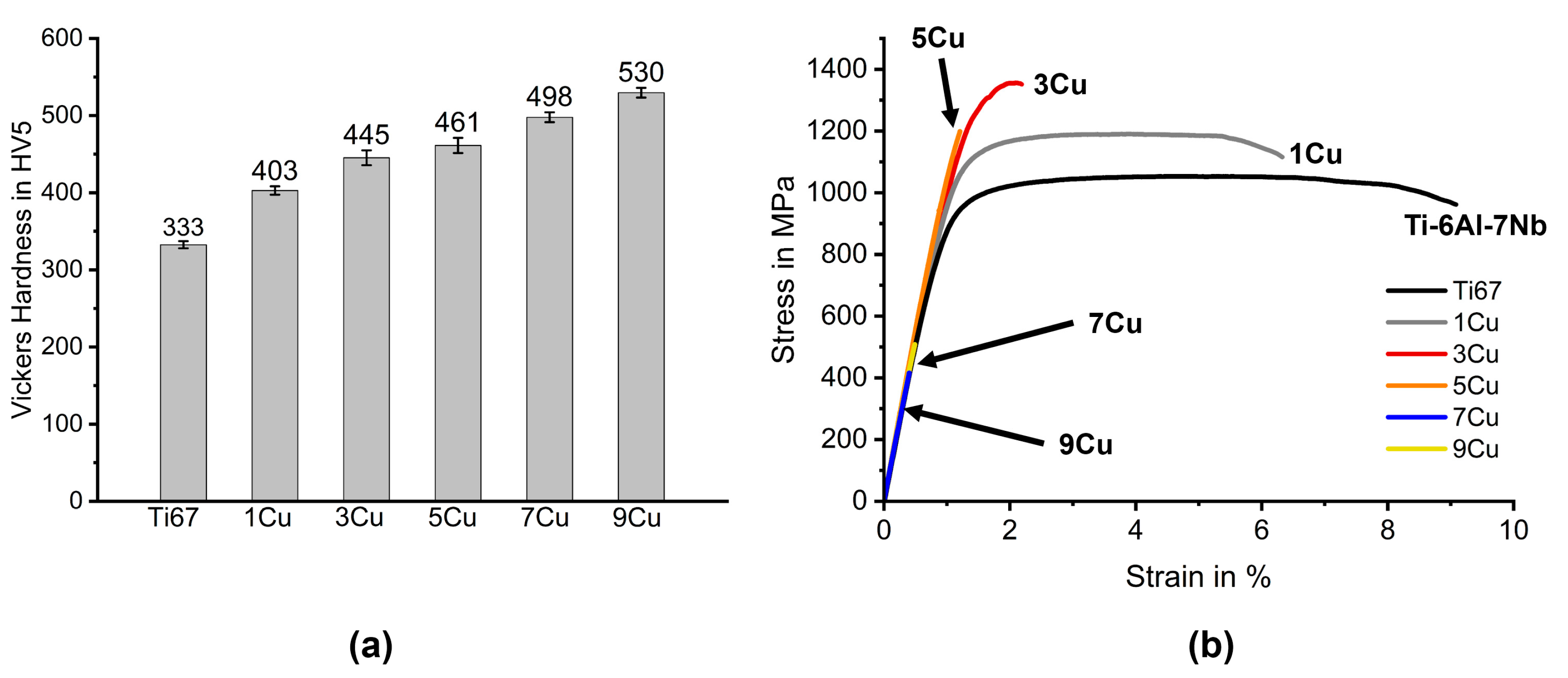 Even though the employed in situ alloying strategy resulted in insufficient mixing, several insights regarding the mechanical properties and the influence of copper additions to Ti-6Al-7Nb can be drawn from the results. The observed increase in hardness with higher copper addition is attributed to a combination of solid solution strengthening, microstructural refinement, and precipitation hardening by finely dispersed Ti