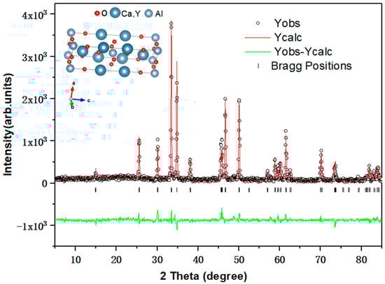 Rietveld refinement profiles of the XRD pattern of Yb3+/Er3+:CYA phosphor.