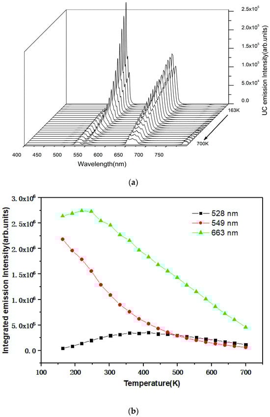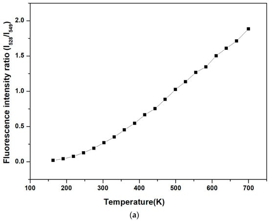 It is noticed from Figure 2a that the spectral position of the three emission bands negligibly changes with temperature in the range of 163–700 K. But temperature has a considerable influence on the intensity of these emission bands. To make it clearer, the integrated intensities of the three emissions centered at 528 nm, 549 nm and 663 nm were calculated and are presented in Figure 2b. When the temperature is increased from 163 K to 415 K, the intensity of the 549 nm emission decreases, whereas the intensity of the 528 nm emission increases. This is due to the thermalization processes occurring between the 2H11/2 and 4S3/2 levels. As the temperature rises, through phonon-assisted thermal excitation, more ions are accumulated in the 2H11/2 level, which results in the increase of in the 528 nm emission (2H11/2 → 4I15/2) and the decrease of in 549 nm (4S3/2 → 4I15/2). When the temperature exceeds 415 K, the intensity of the 528 nm emission starts to decrease;, this is probably because of the increasing possibility of non-radiative relaxations. When the temperature goes up, ions in the upper level are more likely to relax to lower levels. We can find this phenomenon in Figure 2a, where the emission around 791 nm begins to appear when the temperature exceeds 400 K. This non-radiative relaxation and competition mechanism results in the change inof the intensity of the 528 nm emission trend at around 415 K. For the 663 nm emission (4F9/2 → 4I15/2), it generally shows a decreasing trend with increasing temperature, which is also due to non-radiative transition. The slight increase in the initial small part of the curve probably results from population accumulation from the upper 4S3/2 level when the temperature is increased from 163 K to 247 K.