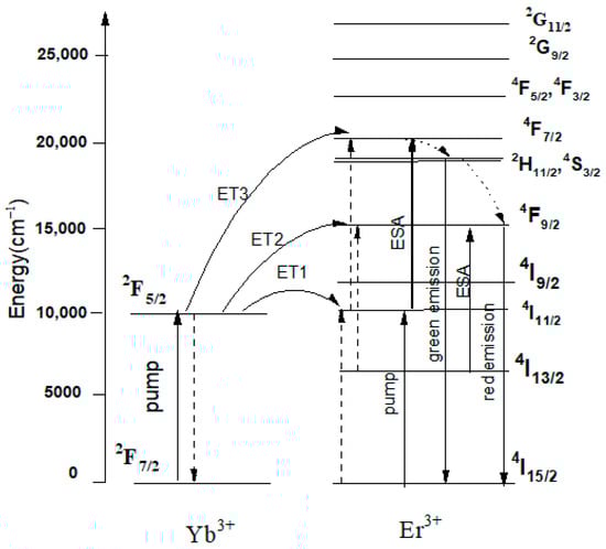 Pumped at 980 nm, both Yb3+ and Er3+ ions can absorb incident energy and be excited to the upper level. But due to the large absorption cross-section and much higher doping concentration, the absorption of the Yb3+ ion dominates. Then the process of energy transfer from the Yb3+ to Er3+ ions plays a significant role in the UC emission. There are three ET (energy transfer) processes occur, ET1: 2F5/2 (Yb3+) + 4I15/2 (Er3+) → 2F7/2 (Yb3+) + 4I11/2 (Er3+), ET2: 2F5/2 (Yb3+) + 4I13/2 (Er3+) → 2F7/2 (Yb3+) + 4F9/2 (Er3+), and ET3: 2F5/2 (Yb3+) + 4 I11/2 (Er3+) → 2F7/2 (Yb3+) + 4F7/2 (Er3+), as shown in Figure 3.