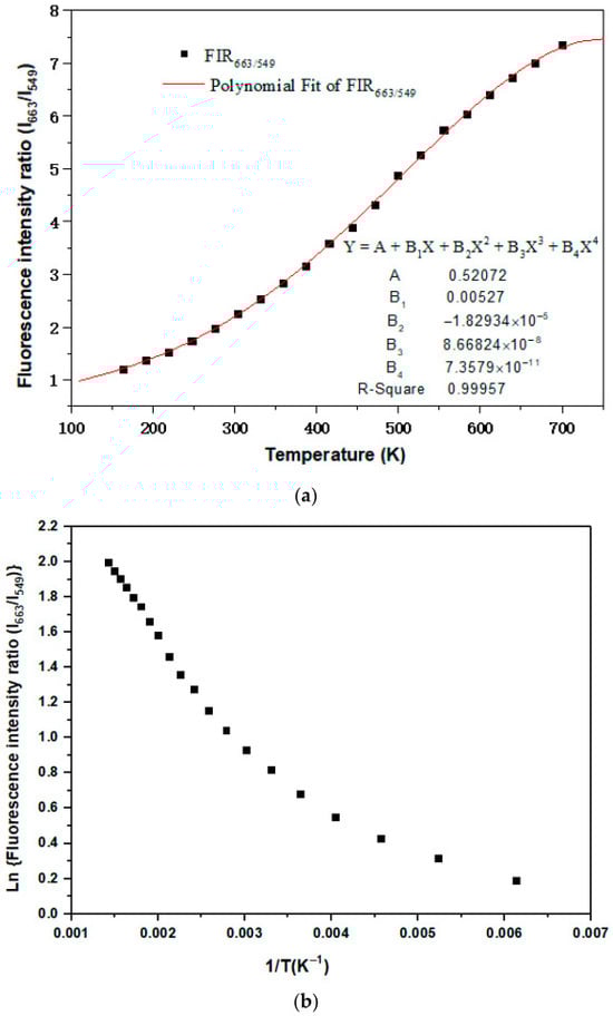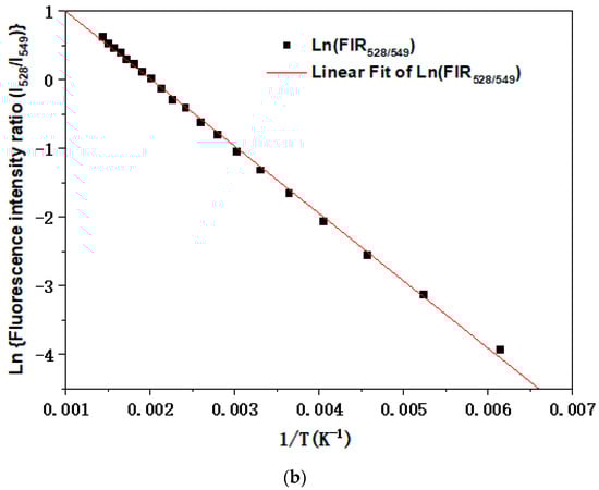 where (higher level) and (lower level) represent the integrated intensities of two thermally coupled levels; , and are the radiative transition probability, the degeneracy and the angular frequency of relevant transition, respectively; is the energy difference between the two TCLs; is a proportionality constant; and and are Boltzmann’s constant and absolute temperature, respectively. The calculated FIR values of 528 nm to 549 nm are shown in Figure 4a, and the logarithmic plot for FIR528/549 versus inverse of temperature is also given in Figure 4b. It is observed that in the temperature range 163–700 K, the experiment values fit very well with Equation (1). The fitting value of is −980.32, and the proportionality constant is 7.185. The energy gap was deduced to be 681.3 cm−1,which aligns with the experiment-determined value 724 cm−1.