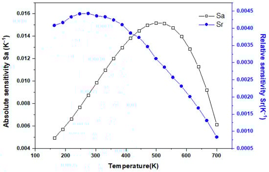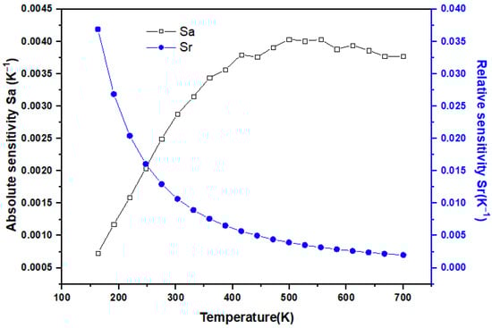 The sensor sensitivity is of vital importance to evaluate the practical application of temperature-sensing materials. It contains two sensitivities: absolute sensitivity and relative sensitivity . The absolute sensitivity demonstrates the change in the FIR with temperature change, and the relative sensitivity is the normalized change in the FIR with temperature variation, as shown in the following equations [6,18].