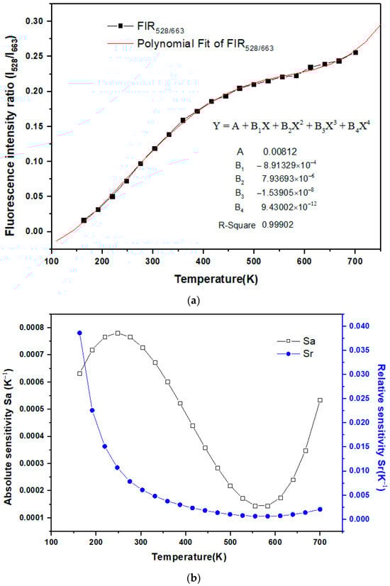 where , , , and are fitting parameters of the polynomial. Then the values of and can be obtained by Equations (2) and (3) as mentioned before. Figure 6a exhibits the temperature dependence of FIR663/549 from 163 K to 700 K. The fitting parameters are also displayed in Figure 6a with a fitting degree higher than 0.999. Figure 7 presents the calculated and values as a function of temperature. As the temperature goes up, both and increase first and then decline. The maximum of and are 15.2 10−3 K−1 at 499 K and 0.443% K−1 at 275 K, respectively.