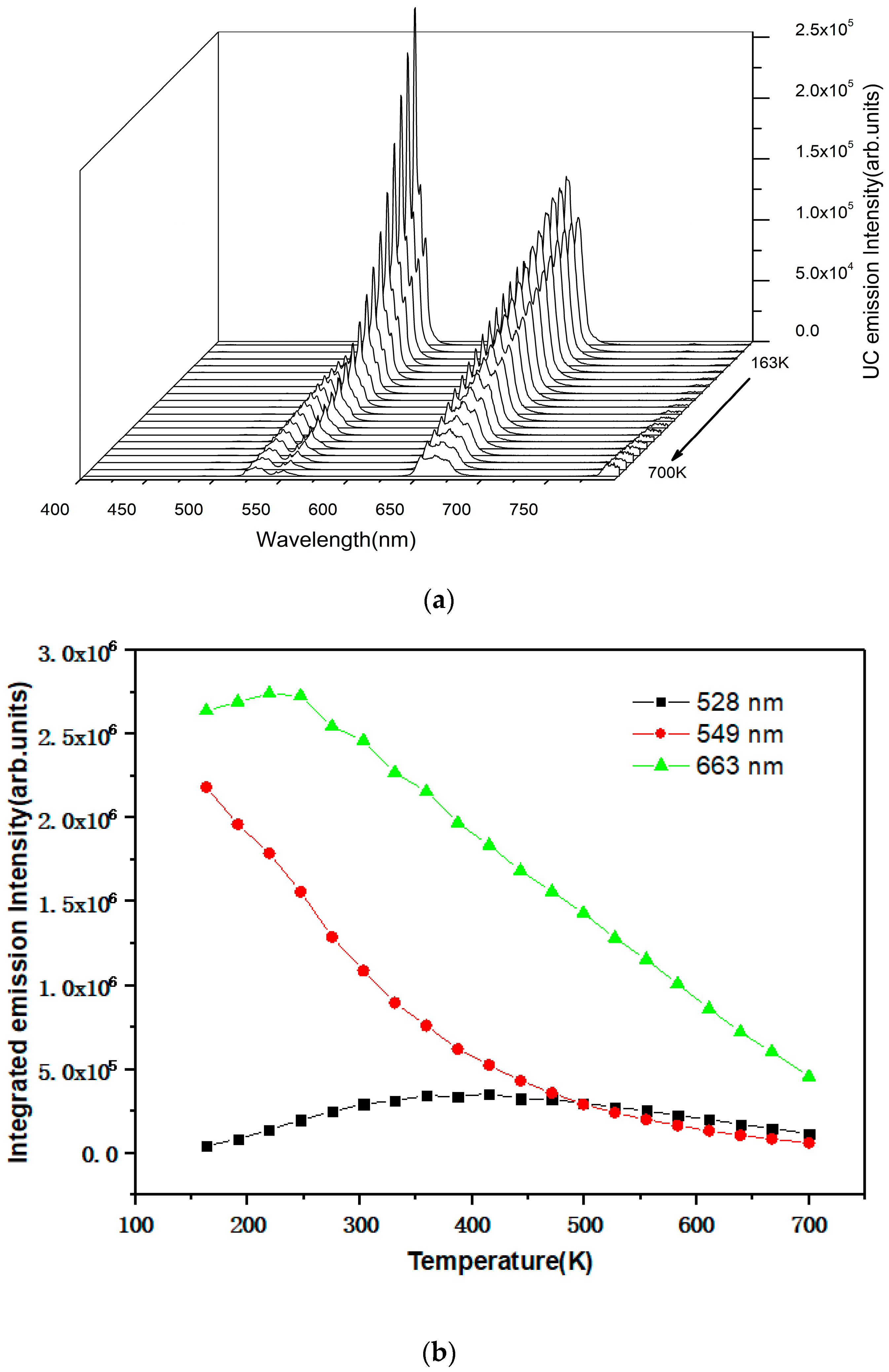 - Feng, Z.; Lin, L.; Wang, Z.; Zheng, Z. Low temperature sensing behavior of upconversion luminescence in Er3+/Yb3+ codoped PLZT transparent ceramic. Opt. Commun. 2017, 399, 40–41. [Google Scholar] [CrossRef]