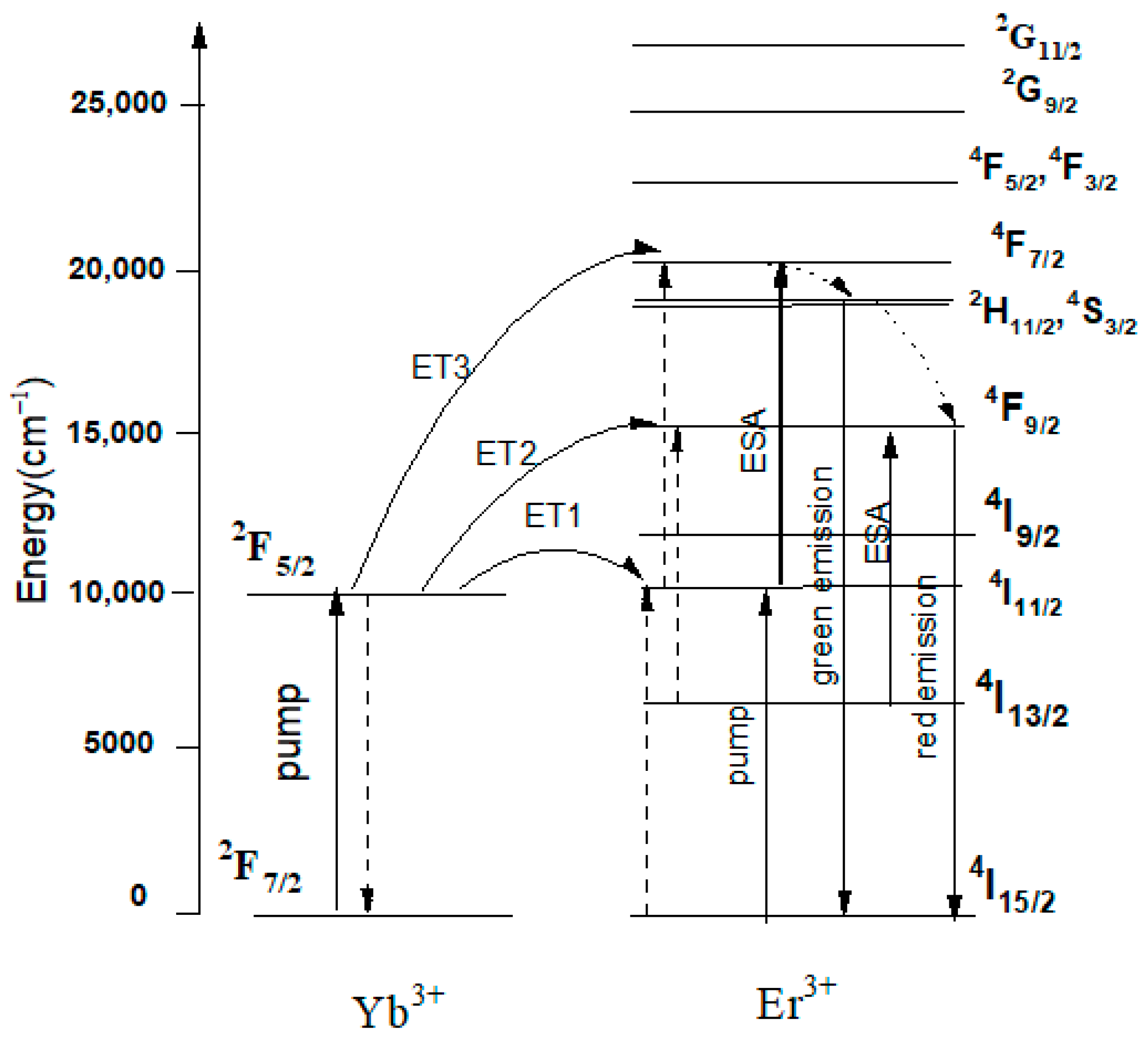 - Dong, B.; Liu, D.P.; Wang, X.J.; Yang, T.; Miao, S.M.; Li, C.R. Optical thermometry through infrared excited green upconversion emissions in Er3+-Yb3+ codoped Al2O3. Appl. Phys. Lett. 2007, 90, 181117. [Google Scholar] [CrossRef]
