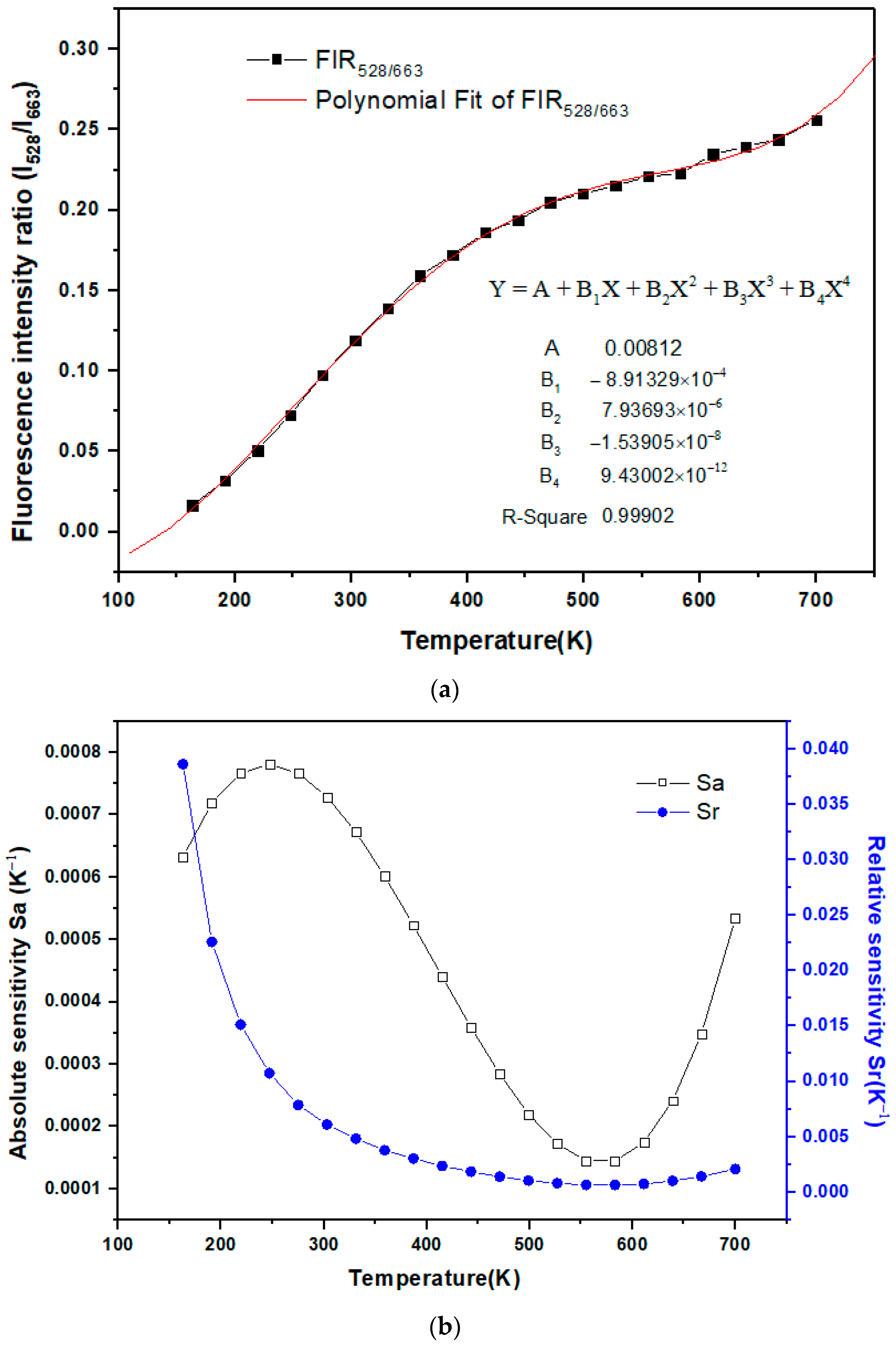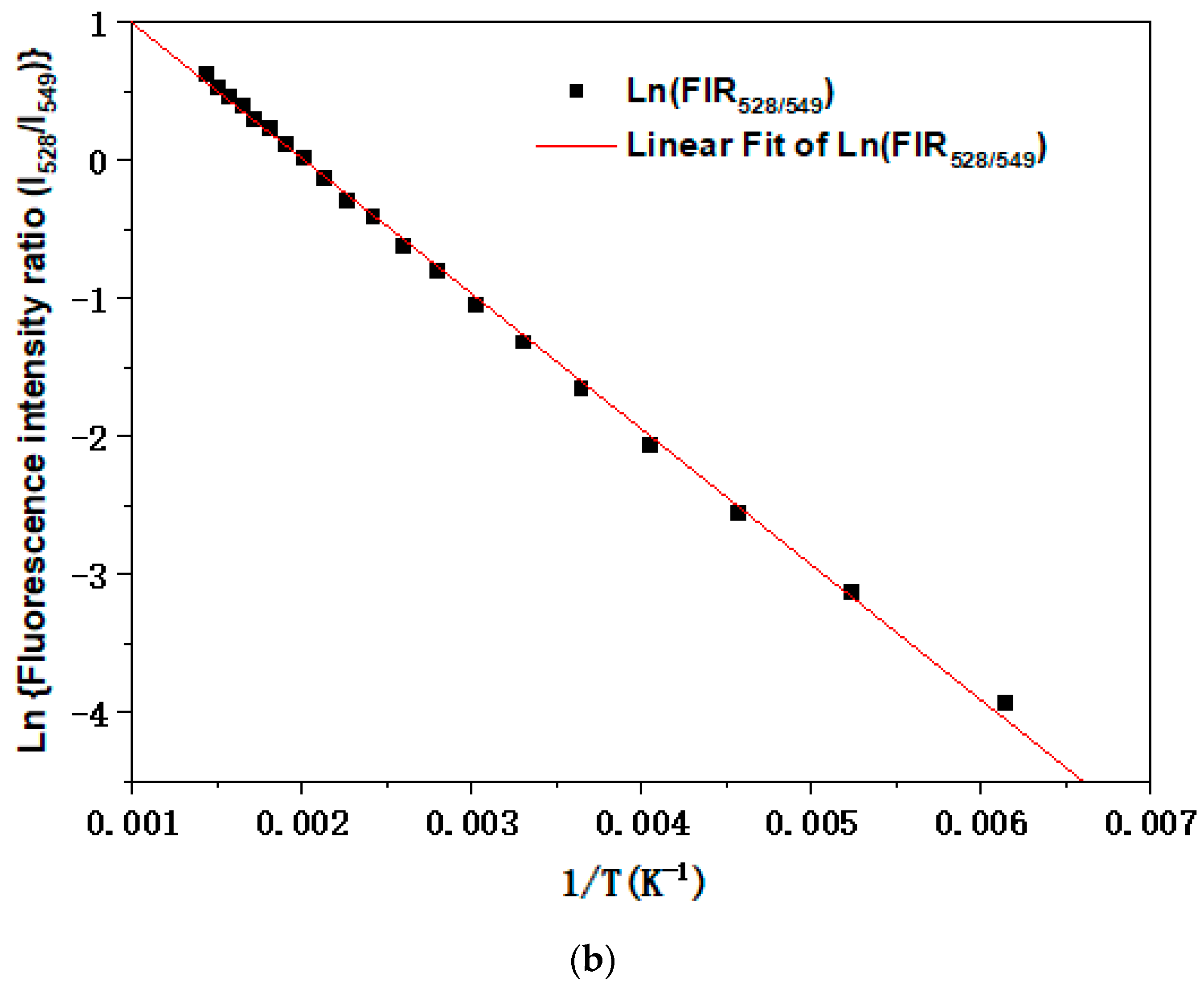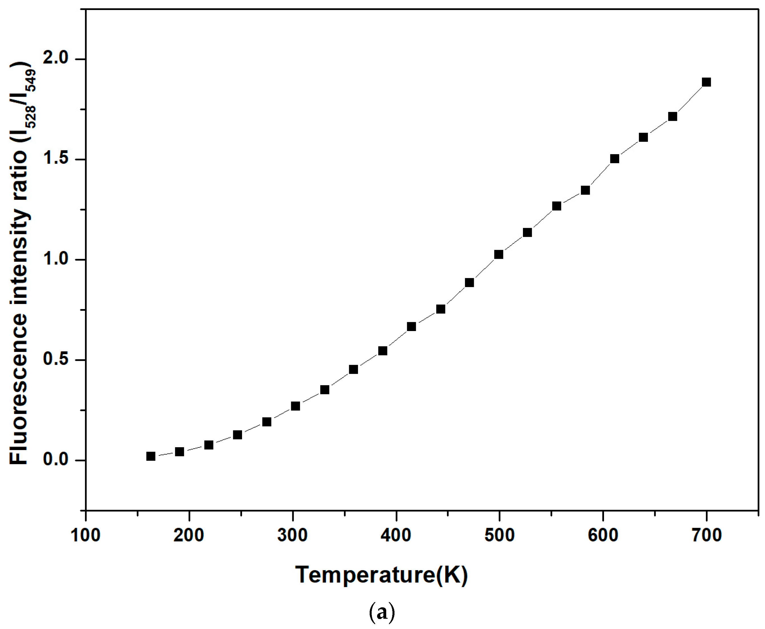 - Zhao, Y.; Wang, X.; Hu, R.; Zhang, Y.; Li, Y.; Yao, X. Improved temperature sensing performance based on stark sublevels of Er3+/Yb3+ co-doped tungstate-molybdate up-conversion phosphors. Mater. Res. Bull. 2020, 131, 110959. [Google Scholar] [CrossRef]