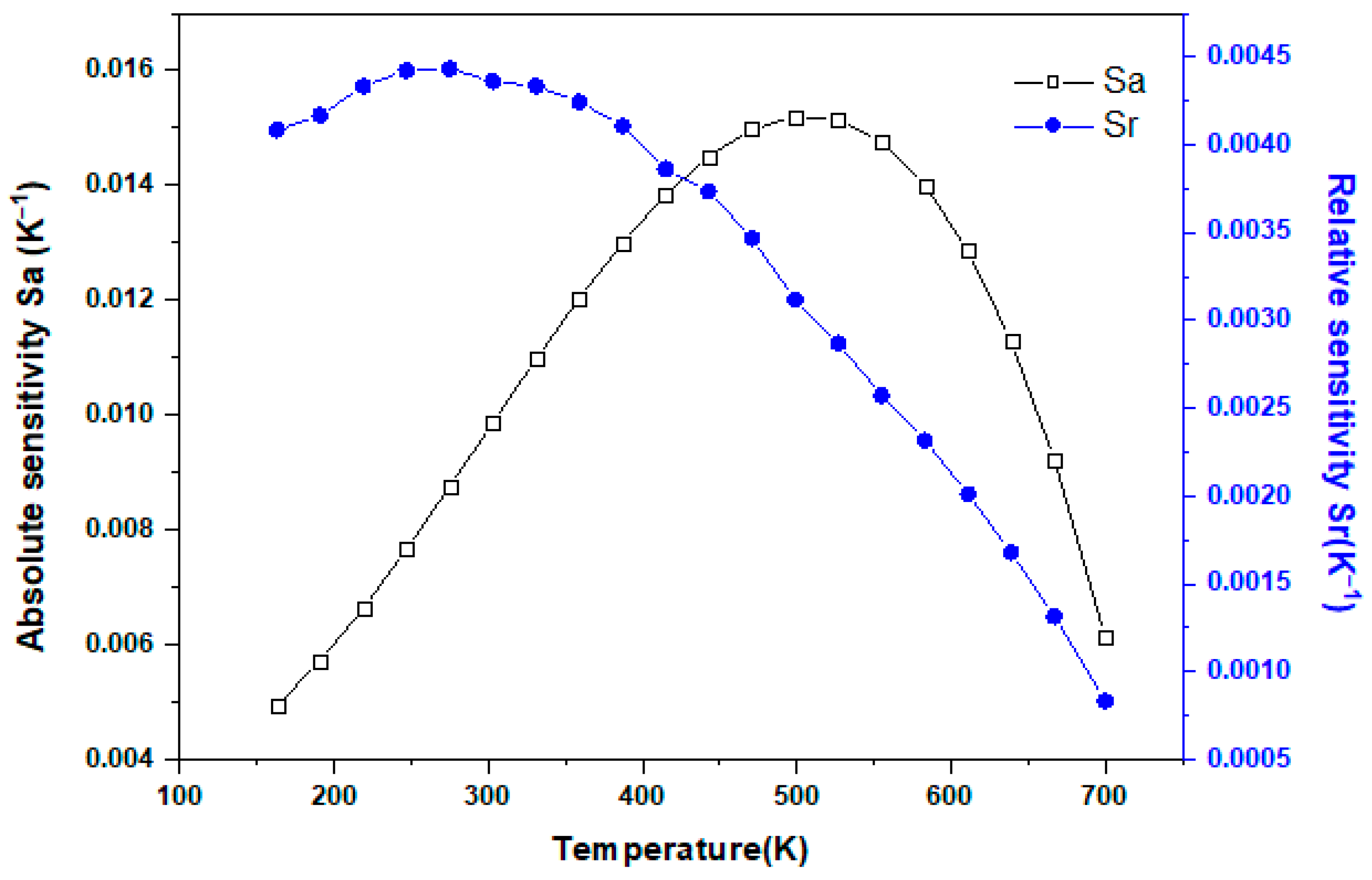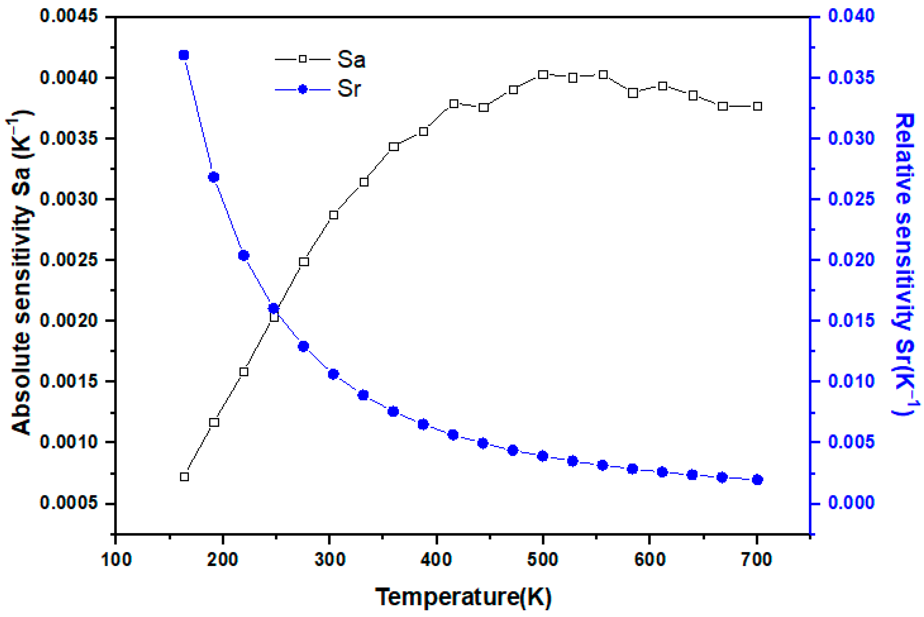 | CYA:Yb3+,Er3+ | Er3+:2H11/2 → 4I15/2, 4S3/2 → 4I15/2 | 163–700 | 3.69 (163 K) | 0.404 (415 K) | this work |