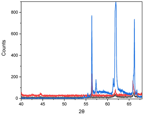 Diffraction patterns of X-rays from nanocrystals after annealing at 800 °C for three different deposition durations (black line—20 min, red line—40 min and blue line—60 min).
