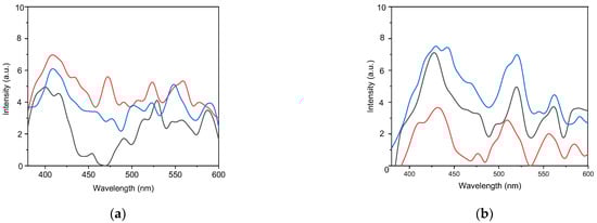 Photoluminescence spectra of nanocrystals for three different deposition durations (black line—20 min, red line—40 min and blue line—60 min) after annealing: (a) at 800 °C, (b) at 1000 °C.