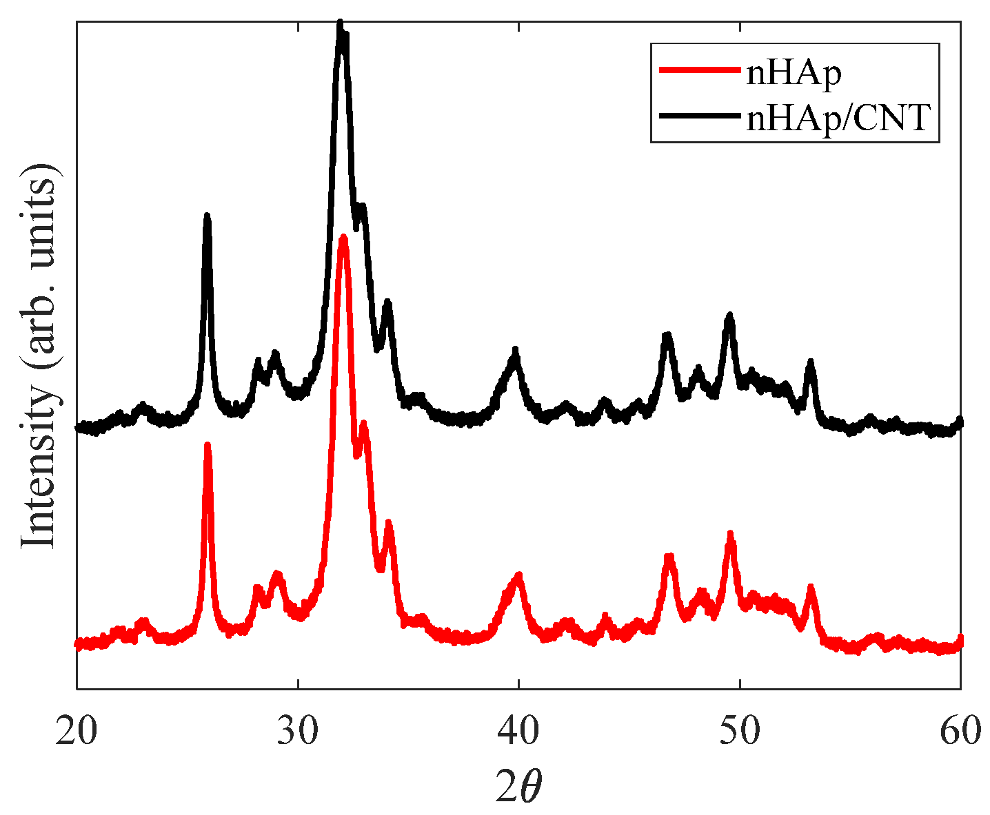 - Singh, L.; Singh, P.K.; Singh, V. Synthesis and Characterization of Carbon Nanotube Reinforced Hydroxyap-atite Ceramics Proposed for Biomedical Applications. Mater. Today Proc. 2022, 60, 1150–1155. [Google Scholar] [CrossRef]