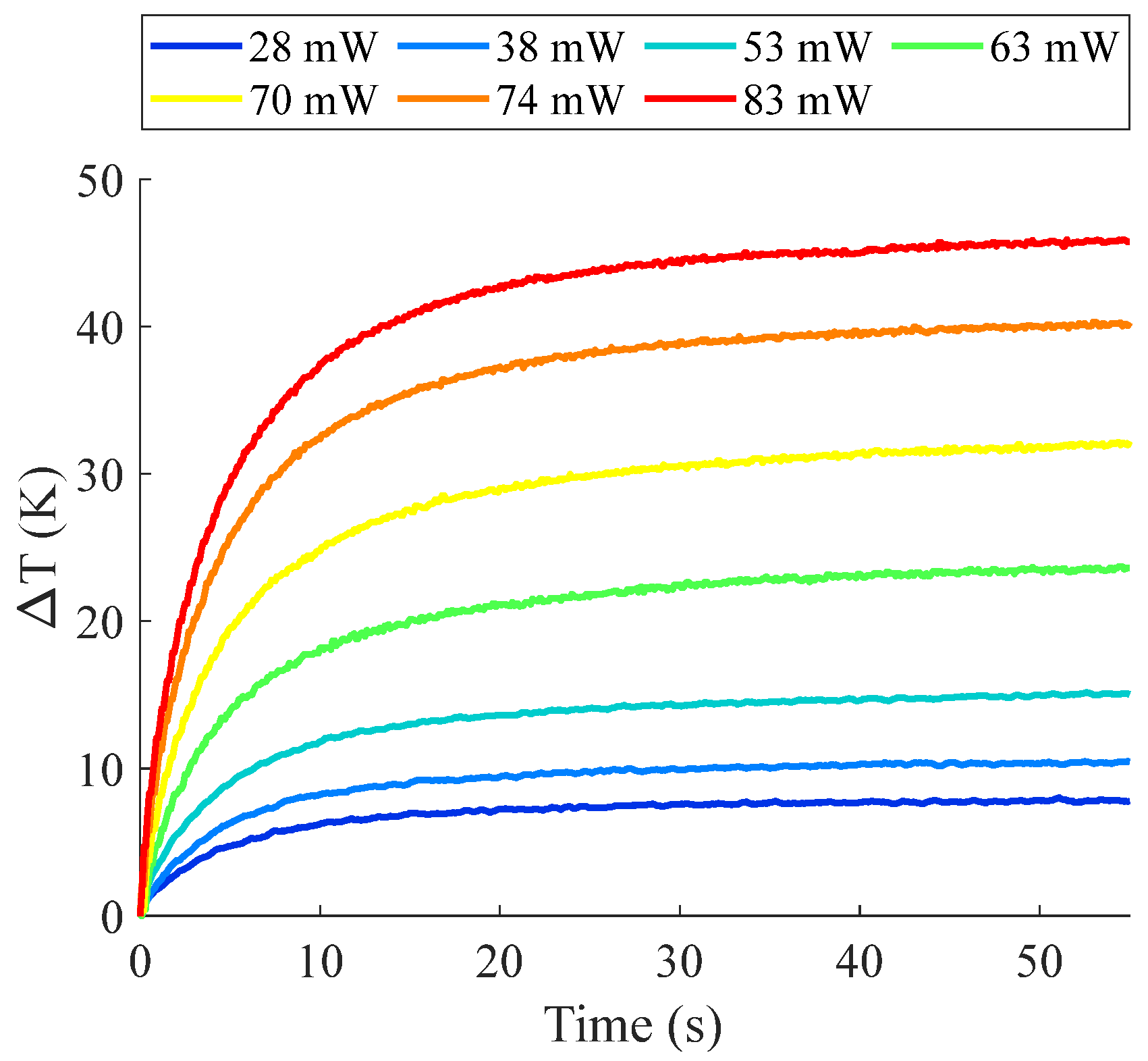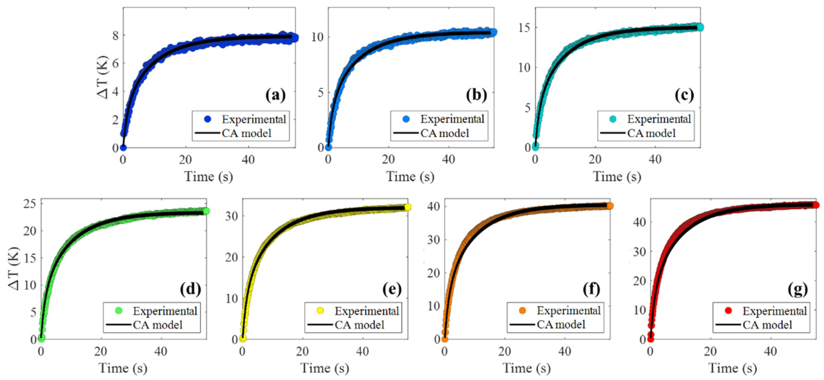| Laser Power (mW) | Experimental Tmax (K) | CA Tpulse (K) | NRMSE (%) | R2 |