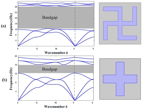 Band structures of SMs with different inclusions: (a) gammadion-shaped chiral inclusion, (b) cross-shaped inclusion.